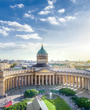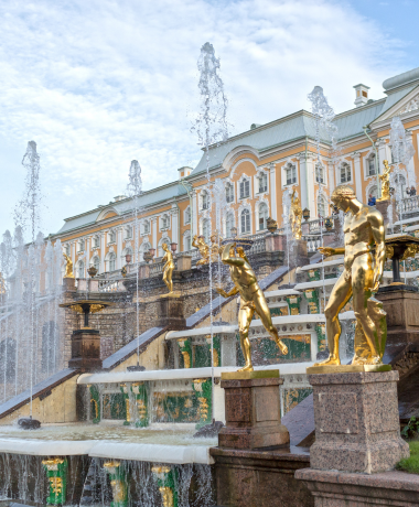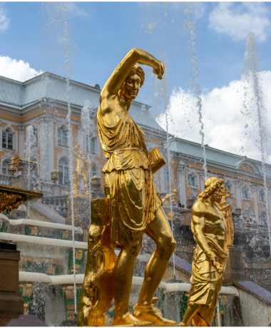 After breakfast, meet your guide and set out on an excursion to Pushkin (Tsarskoye Selo). Visit the magnificent Catherine Palace and Park, home to the famous Amber Room, and admire its stunning architecture and beautifully landscaped gardens. Enjoy lunch at a local restaurant before continuing to Peterhof Fountain Park, often referred to as the “Russian Versailles,” celebrated for its grand fountains and elegant gardens. End the day with dinner at a restaurant before returning for your overnight stay in St. Petersburg.